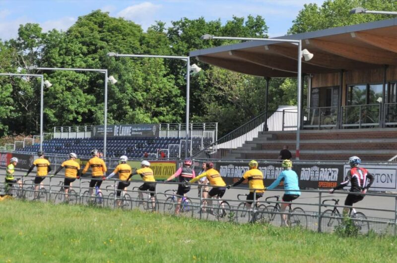This year’s session was held on Tuesday 17th May. As in previous years we gathered at the edge of the track to watch the end of the previous session before making our way to the “bike sheds” which are shipping containers filled with single speed, fixed gear track bikes with no brakes.