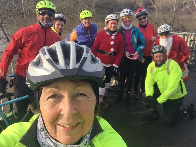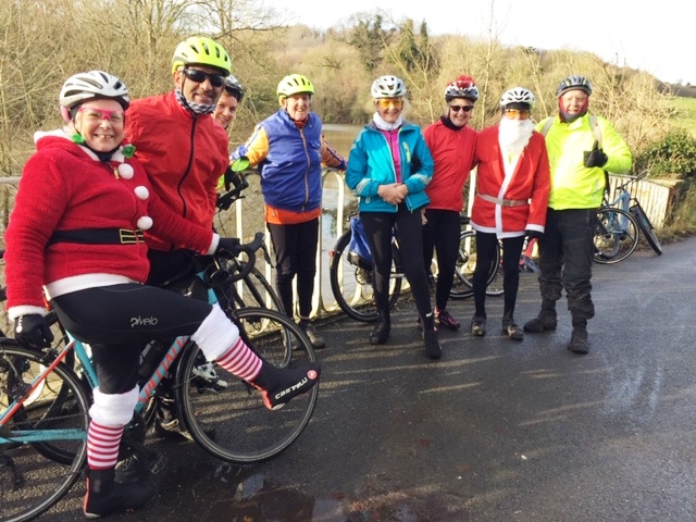 The Fast group and Steadies combined, with many dressed in Santa’s red, set off to Polhill with it’s Christmas market atmosphere. We the more relaxed riders, 9 in all, including another Santa and red coated helper, decided on Denbies, for a less crowded tea stop venue.