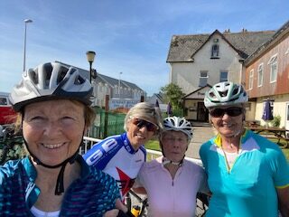 Then 30 flat miles along the water’s edge in glorious sunshine with an ice-cream stop. By the time we’d come to the end of the Tarka Trail and I’d reassured the others that we were not going back via Woolacombe, they were all expecting an easy cross country nip back to Ilfracombe. A rude awakening when we took a left turn off the trail onto what looked like a vertical road. Absolutely no chance of riding up so we had to walk. I was sure the top was in sight and indeed it started to ease off enough to get back on the bikes so off we went again until the next bend and the next and the one after. 5 miles of hill all the way (around 16%). We were so grateful to finally arrive back at the Fortescue Arms and the comfort of our cars. After a quick change and a cup of tea with plenty of banter from the pub landlord, we took to the road for the 5 hour drive home. The drivers – Jo and Carmen must have been exhausted, in hindsight it may have been better to stay an extra night.