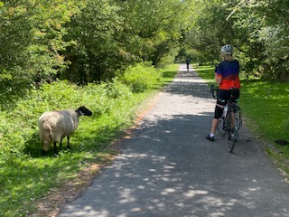 The rest of our journey had no more obstacles and we had a clear and mainly downhill ride to Plymouth. At one point we had to nudge sheep out of our way who were blocking the narrow track.