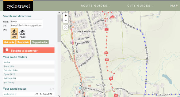To save me trying to describe the route I took, this is my favourite site for plotting routes – Cycle Travel, below ( https://cycle.travel/ ). You can see the main railway line on the left of this map section, and to it’s right, the red dots are Rt 21. At bottom of map at Salfords, we crossed over Honeycrock Lane to continuing on Rt 21. A hundred yards on is a sports club ground with a club house and it’s tearoom. These facilities are now also shared by Redhill Cycling Club – you can’t miss their big sign!