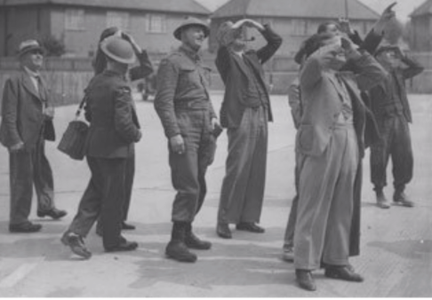 This photo is of the raid by the German bombers at the very beginning of the Battle of Britain. Tasked to attack Kenley Aerodrome, but due to a navigational error, instead they attacked Croydon Airport. My mother, like those above, watched the melee of British fighters and the German attackers in the sky above. I was in my cot and slept through all the action!