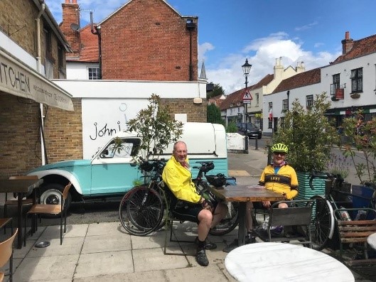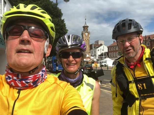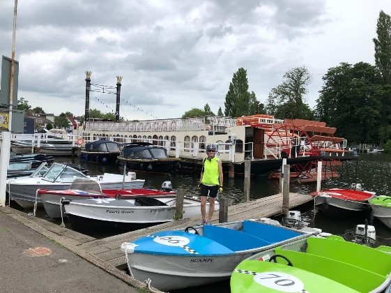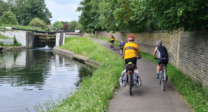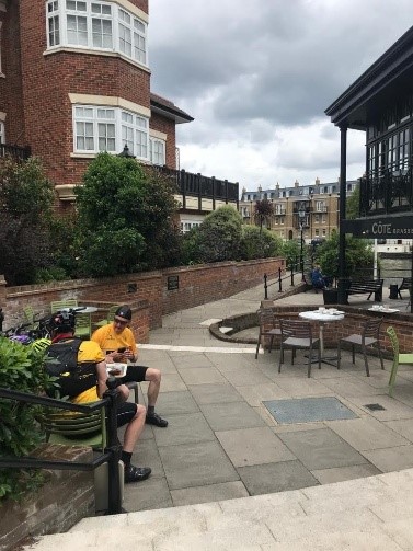 The Wandle Trail looked lush and green as we meandered Northwards, we skirted around the North of Wimbledon and arrived at Wimbledon Village. My offer of a look at the tennis was politely declined by all, so onto and through Wimbledon Common, initially taking the group the wrong way, Roehampton and into Richmond Park. Part way around the park on the Tamsin Trail before exiting Northwards into East Sheen followed by Mortlake and then The River Thames. This we followed until we crossed Kew Bridge and turned Westward along the side and below the elevated M4. We crossed the M4 via a nearby elevated walkway and returned to the required junction. Led the group up into a dead-end before turning and accessing the Grand Union Canal. We travelled along the towpath until deciding we deserved a coffee stop. Cafe selected and we secured bikes, ordered coffee, used facilities, discreetly scoffed our own foodstuffs etc and waited and waited for our never to arrive coffee. On departing, we went off route and got Monica and Geraldine safely to Southall train station where we said our goodbyes. Now we were just 3. Back to the canal and West we went. It quickly became apparent that our smaller group although chatty was very much less chatty! A few miles further along the mixed surfaces (some brand new, some definitely not) of the towpath, right at the edge of the water and we turned left onto the Grand Union Canal – Slough Arm. Forgot to mention that at 1 point we went uphill over about half a mile, passing lock after lock after lock (are there 13 of them?). Impressive. Plenty of life on the canal as well. Enviable lifestyle. About halfway along the Slough Arm and John suffered a puncture on his rear wheel caused by a discarded ink pen cartridge. He had only put these tyres on, brand new the day before. One text book puncture repair later and on putting the wheel back and testing it found that the ink cartridge had affected his brakes and mudguard as well. Whilst trying to assist / not get in the way Alison and I managed to scoff some food and drink. Before we knew it our turnoff appeared and we left the quietness of the canal and headed South to Windsor and our first proper coffee stop.