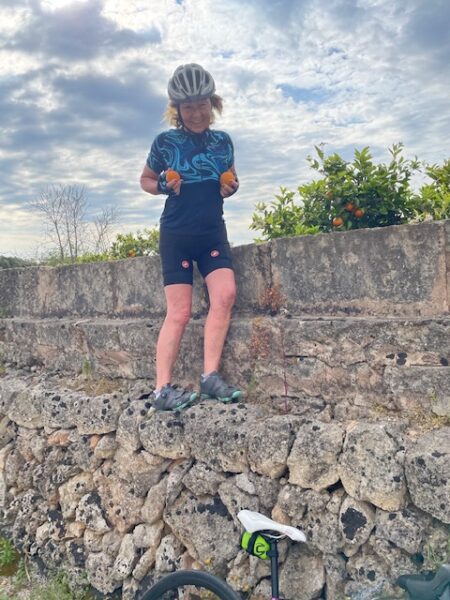 Or Denise reaching over a wall to scrump a couple of oranges on her training ride with Jo. Yes, we have the evidence!