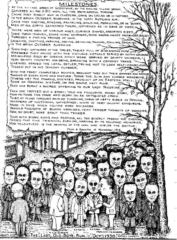 The first Old Boys Run was held in 1905. That for 1914 was held in October, only a few weeks after war had been declared in August. It is probable that the above poem was written after this event, held at Godstone’s Clayton Arms, to remember those peacetime bike rides over the many earlier years, to this idyllic little Surrey village. Today with the benefit of hindsight, the words are a poignant reminder of the many Anerley young boys who were killed or maimed in the terrible, following years of W.W.I