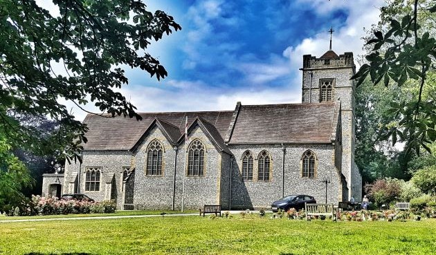 En route, we passed through many of our wooded country lanes. Along the north downs ridge at Woldingham, down Clacketts Lane, up and over Limpsfield Chart – but not a sign of any colour blue. We did however stop briefly at the Chart’s village church of St Andrew