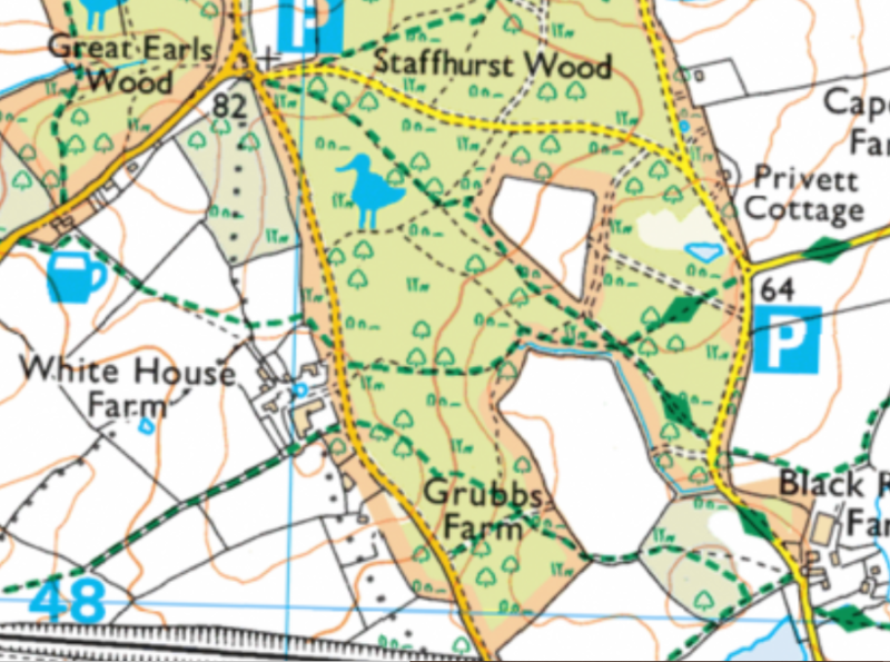But you will be pleased to know, that after climbing Wolfs Hill you go right DOWN Pollards Wood Hill and continue straight on for a couple of miles, passing through Staffhurst Wood, until you come to the main part of the wood. This is via the road, at top left of the map below, to arrive adjacent to the P marking a car park.