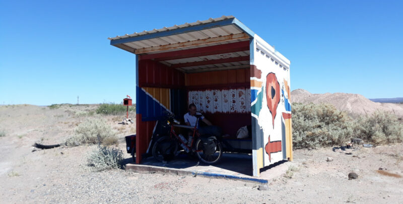The scenery was desert like and extremely dry. This bus shelter was the only shade we could find and we took the opportunity to have our usual lunch of tuna and dried biscuits.