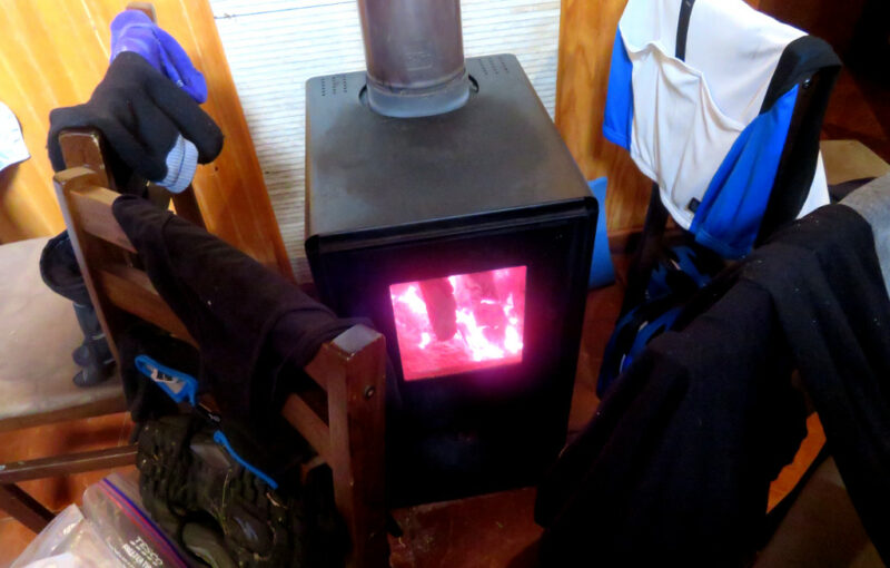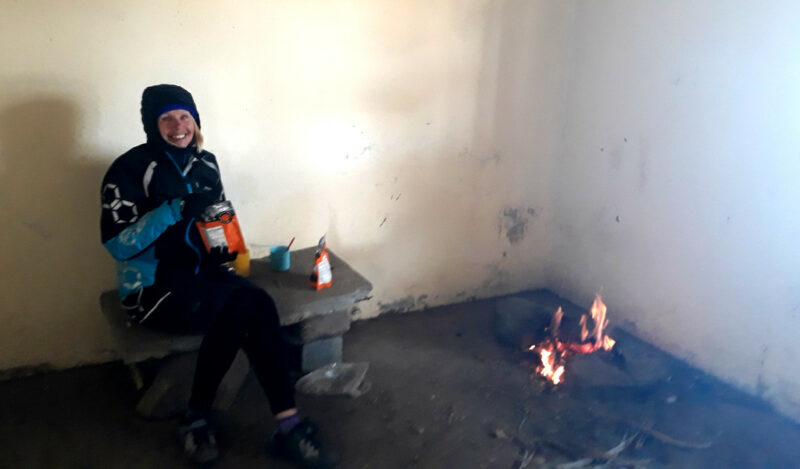 The next day we felt the wind on our tent and knew straight away it was going to be ‘breezy’. Tim cycled in front and I tucked in as best I could. We were now on a much quieter road at the bottom of the climb towards the Andes. The wind increased during the day and we realised the 68 miles on the schedule was not going to happen. We could possibly do around half which would bring us to a small ski resort (two buildings) at which the internet had mentioned a café. All day we struggled against the wind but the thought of the café kept us going and eventually we rounded a corner and there it was – completely derelict. It looked like it hadn’t been opened for years and it was getting late and cold. I could not believe that I’d been too hot the previous day and now I was shivering. Putting just about all my layers on, we found the cleanest room and I swept away the debris with a broken branch that acted like a broom. Tim quickly made a fire whilst I tried to block the wind coming into the window hole (no glass) with lots of branches. It worked a bit and we began to feel better – especially after eating one of our ‘emergency’ meals of stew in a bag. We slept on the floor and even my fears of someone finding us and taking our belongings or dogs attacking us couldn’t keep me awake and I slept soundly.