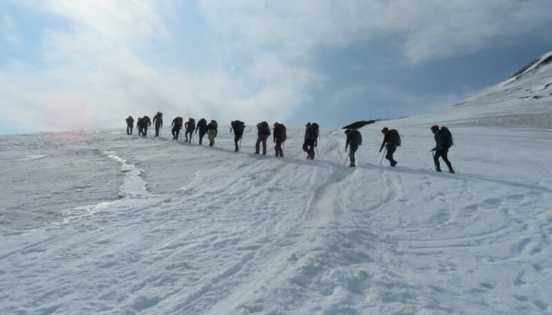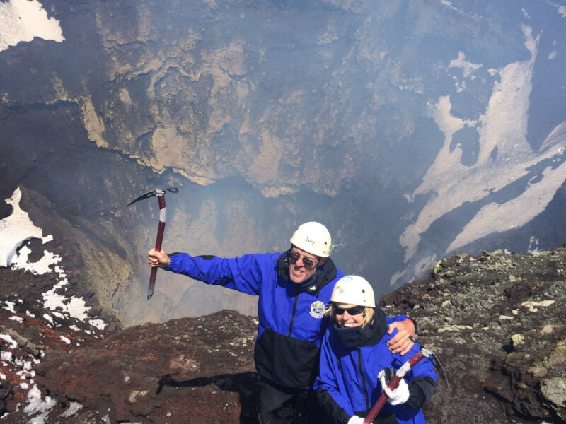 We booked to climb the volcano the next day with a company that would provide everything we didn’t have – boots, ice axe, crampons and a rucksack as well as warm clothing. We had to be at their office at 6am so cycled from the campsite the next day in the dark. Our guide, Nacho, turned up and began by explaining everything to us. We had a large plastic plate in our rucksack that we would use to get down the mountain. This sounded like far too much excitement for me but I was committed. We were taken by an elderly gentleman who owned the company to the base of the volcano and then started our long climb to the top. It was very steep in places but the path zigzagged across the ice and we were shown how to kick into the snow and ice to help keep balance as well as use the ice axes as walking sticks. There were many large groups on the volcano and I was keen to get to the top without hundreds of other people ruining the view! Nacho was brilliant and walked at a very steady pace. We followed in his footsteps and were able to keep going, passing group after group when they stopped to rest. It made a big difference being just the two of us as our ‘rests’ took very little time compared to a group of 15. Eventually we reached the top first but just in front of the first big group, so eagerly took our photos. Our Guide kept telling us how well we’d done for ‘older’ people and couldn’t help but ask how old we were. He was probably early 20s so I guess 60 sounded impossibly old!