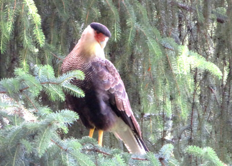 After the border crossing we saw a café sign down a narrow track. It was getting a bit late in the day but we decided to go for it – cafés can be few and far between – we followed the narrow track and it wound it’s was through field after field. I’d just begun to despair when a ranch style building came into sight and outside, in a pretty garden area and pristine lawn, were table and chairs set out with linen table cloths. It was really lovely and we enjoyed tea and cake. A large bird called a Carancho was nesting nearby and we spent an age watching it.