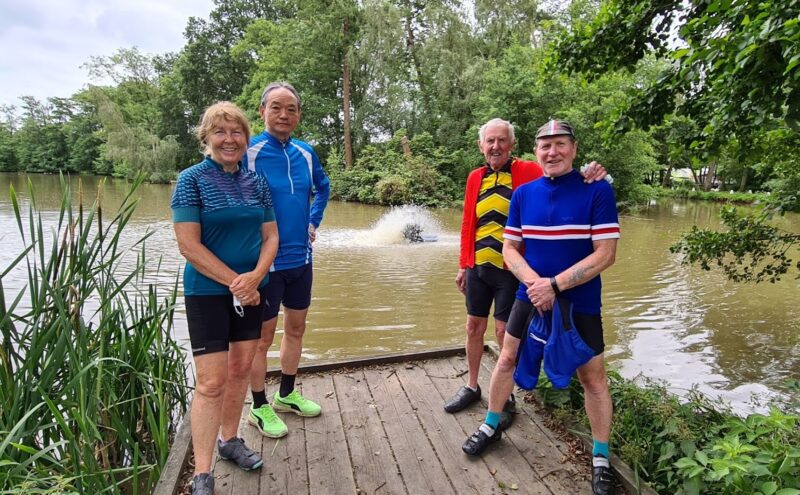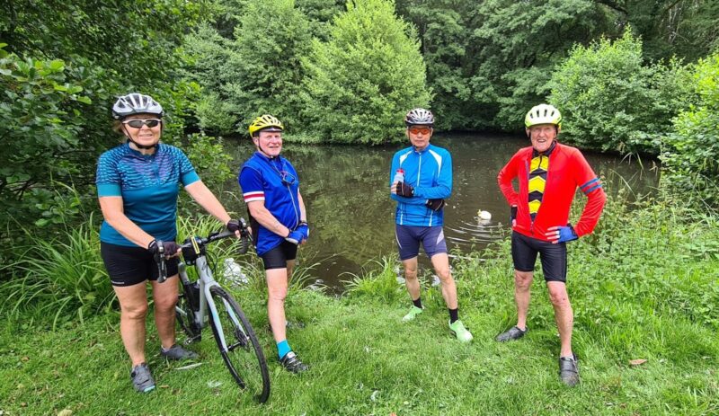We set off via Boxhill (an error as teeming with cyclists, bikers, hikers and cars!) But turning off to Pixham, the traffic subsided and the climb up the steep, Punchbowl Lane was a real pleasure in the dappled sun light. From there it did not take long to arrive at our morning tea stop beside Henfold Lake.