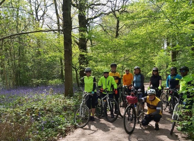 April lived up to it’s reputation of showers – lots of them this year, but the forecast for Saturday 29th was for a warm and sunny day. It had been my intention to lead a Bluebell Ride to Staffhurst Wood, but after the torrential rain of the two prior days, and likelihood of thick mud, it seemed likely that a ride through the woods was out. But at least we would be able to see the bluebells alongside our country lanes, so the ride went ahead.
