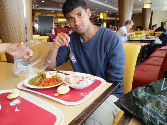 Leaving home with Tom at 5 o’ clock in the morning, the first top up was most welcome at a cafe at Horsham. Ricky and I, not wanting a start before dawn, travelled by train to Horsham where we joined them. For us, just a cuppa, for them a full English fry up. But this did have to last well into the day, as lack of cafes meant that lunch was not taken until long past high noon. The next greasy spoon only being sighted when we reached Havent, not far from our destination, the ferry at Portsmouth. Having survived this first lengthy fast, Christopher made up for it as we sped onwards to Spain. The on board cafeteria providing a new meaning perhaps for fast food!