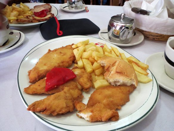 But Tom, Christopher and Ricky were more interested in the 9 euro, 3 course Menu del Dia. This typically offered a starter of a fabada or the option of a fish or meat soup, with as much bread as you could eat. I found that just this first course was enough for my smaller appetite, but the other carbo loaders went on with the next, main courses. These being a meat or fish option with the universal heap of chips. Then to finish off, a sweet such as a caramel flan. And not forgetting a bottle of water or table wine. Below is a main course that Christopher tucked into to. I am not sure if this was solomillo de cerdo y patatas fritas (pork tender loin and chips to you and me!) or perhaps its sea bass.