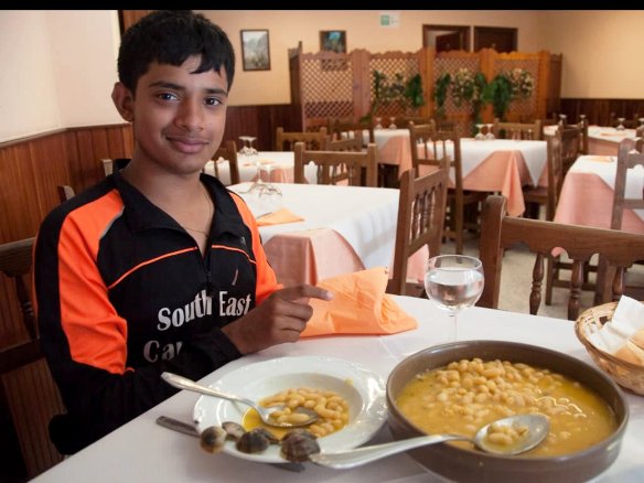 I think it was this that convinced Luke of the necessity to carbo load when out on his bike, for by the next morning it was calorie counting in earnest, starting with a full breakfast on the terrace, and more than just a bocadilla for lunch. A huge bowl of bean fabada was just the starter of the three course Menu del Dia, plus bread and a drink, all for about 9 euro. No wonder Luke is smiling!
