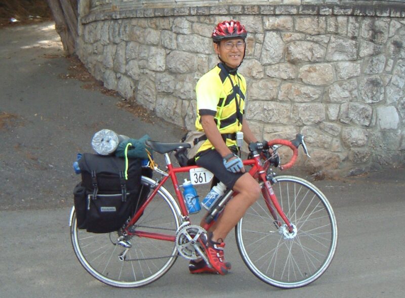 Next, another long climb over a mountain ridge and time for elevenses. Wet and deflated, Ewa had her 4th puncture! But at least the rain had stopped when later, we had our picnic lunch in a chestnut orchard, (or is it a nuttery?), by a mountain stream.