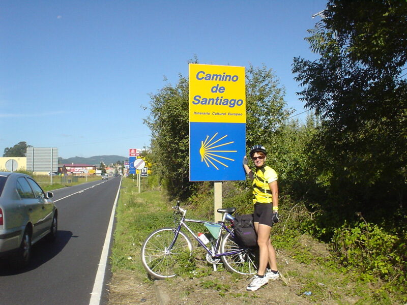The Camino now following winding country lanes, more steep ups and downs through scenic woods and fields. Eventually we came to a main road and a big sign showing that we were indeed on the right road towards our final destination at Santiago.