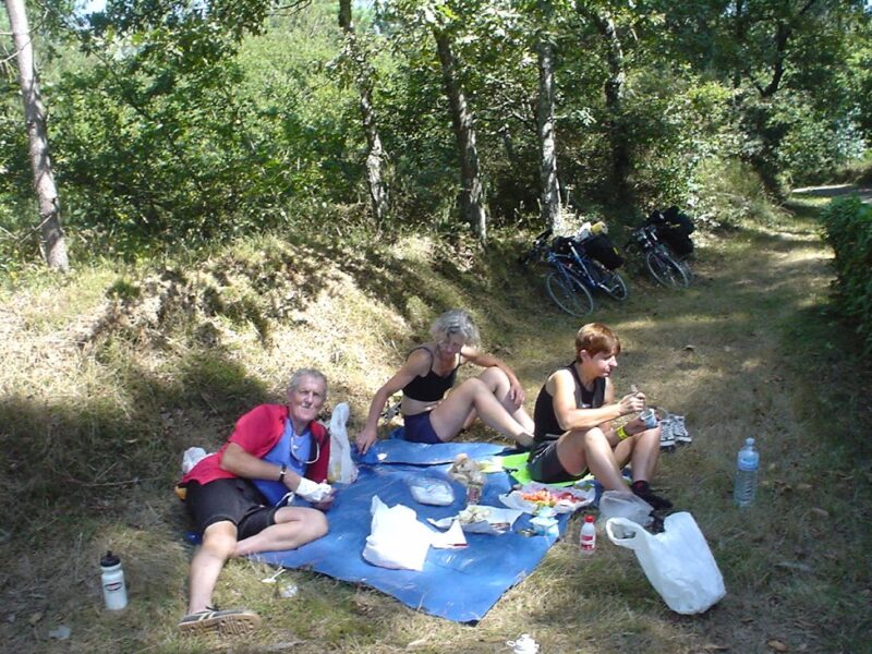 After the extremes of a night in a Spanish barn, and then a night in the splendours of the monastery at Sobrado, it was time to move on towards our destination at Santiago Compostela, which was only some 50 miles from the monastery. Our elevenses stop was at the small town of Arzua where we joined the main east-west road to Santiago. This was also the main pilgrims’ route along the Camino Frances, six weeks on foot from Paris! Here we stopped for refreshments, sitting under the shade of trees in the main plaza, and watched the world go by. Pilgrims on weary feet, loaded down with heavy rucksacks, and lots more travelling on mountain bikes. Next we visited a mercado to buy food for our lunch stop and left Arzua along the Camino, a narrow, medieval road. Shortly the Camino became a track which wound its undulating way through oak woodland. A perfect, shady place for our lunch stop.