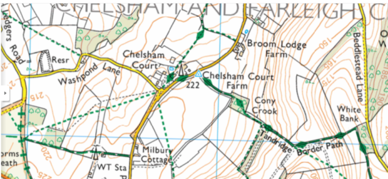 You can see Beddlestead Lane on the right, and the Tandridge Border path weaving it’s way between woods and fields. And the many contour lines showing the challenging, steep ups and downs of the hills and valleys. But what is the faint, little blue symbol where the Border Path meets the road adjacent to the telecom mast?