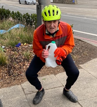 I’ve often wondered why Des’s panniers always look so full and we often see a vast array of tools coming out together with a selection of jackets (some are carried for others!). I’ve even seen an Amazon parcel pop out (it contained his latest cycle training book) but this day’s little wheeze was a milk carton, a 2 litre one which thankfully was empty.