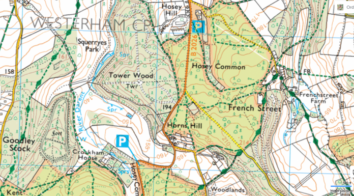 For example, below is a small section of a Michelin “Outdoors” map section, covering an area which includes Emmetts Gardens and Ide Hill at top right, and Toys Hill at centre bottom.