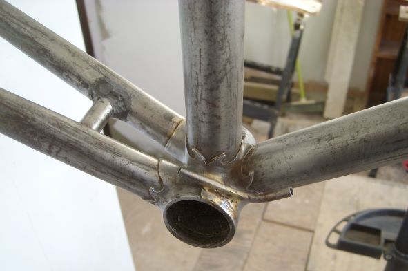 After stripping the frame, I cold set the rear dropouts, to widen from 115mm to 131mm. This would allow me to fit modern back wheels with wider cassettes, modern bikes having more gears than in times past! I used a homemade tracking bar to get the dropouts equal, I had watched Winston Vaz, a skilled builder of bike frames, cold setting at his workshop in Hither Green. Winston started his frame building at Holdsworth, now he has his own bespoke business Varonha Frameworks, he did four of my steel frames cold setting them, so I knew what was involved.