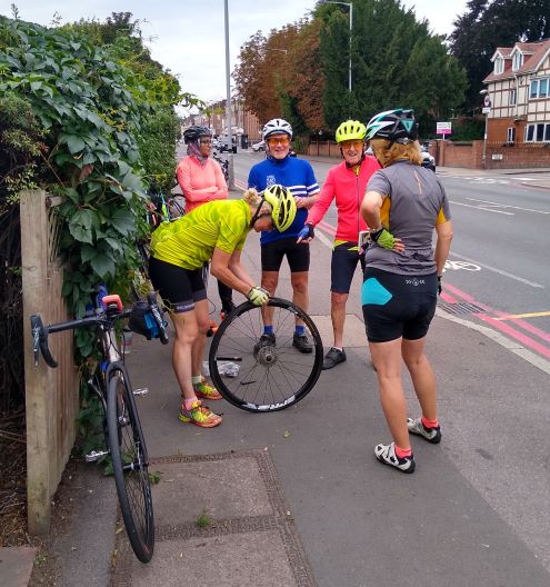 My first Autumn ride on Sunday 4th September was very well attended – 10 turned up for a ride out to the Vineries Garden Centre Coffee Shop at Effingham. Unfortunately we had a bad start for the first 7 of us setting off from Shurgard. We had only just got past the Tesco roundabout when “puncture” was called by Julie, so we all pulled in off the road.