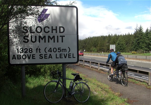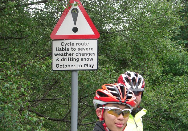 We only got to Perth before the rain caught us. It got heavier and heavier and by the time we got into Pitlochry for lunch we were all soaked and miserable. The ride was beginning to get serious! We took our time and were gratified that the rain subdued on by the time we had passed Blair Atholl had stopped. However we were climbing and climbing alongside and sometimes on the awful A9 which was prefereable to some of the badly paved cyclepath. Not helped by this sign …
