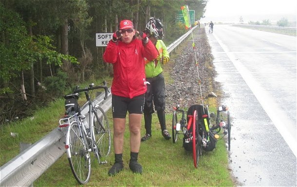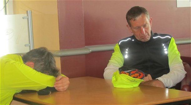 Don’t ask me what I’m doing and yes, that is a recumbent trike. It was just grind now. We knew there was a bad hill coming. What our leader had hidden from us was that there was an even harder hill behind it. Things were getting desperate. I needed another Mars Bar and spotting some comrades sheltering in a bus shelter I pulled up only to have a decleating moment. I lay on my back and could do nothing but laugh as loud as I could at the ultimate indignity in front of my peers.