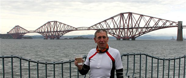 But it didn’t last. We were entering the Central Belt. The weather got grimmer, the towns too and especially the roads. There is no way round Edinburgh and it is damned hard to ride through it. Holes, tram works, it seemed to go on for ever. We escaped by riding along a near motorway until we got to Queensferry for a very late lunch. At least we could get the obligatory photo of the Forth Bridge (the old railway one which works as opposed to the new one which is disintegrating).