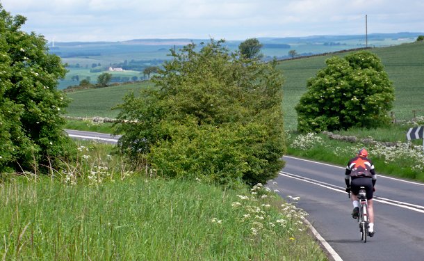 A ‘hilly’ day that would see us in Scotland and passed the half way mark. The forecast was dodgy so we made an early start. This would enable us to miss some of the heavy traffic on the A68 before it becomes a country road that takes a Roman approach to the local contours. Sixty blind summits made for some exhilirating riding as we spread out into groups or, as below, riding alone in a true paradise …