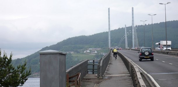 A long enjoyable descent towards Inverness. Somewhere I clocked 41.5 mph without noticing. But the bridge there was nearly our nemesis. The dual carriageway A9 takes no prisoners. You have a choice of playing chicken with left turning lorries to get to the footpath or keeping to the road. Our youngest member got clipped by a wing mirror. Those of us on the footpath already narrow and furher narrowed by road signs were buffered both by the wind across the bride and the turbulence by the heavy lorries as they passed only a few feet away. We were very glad to get off that road.