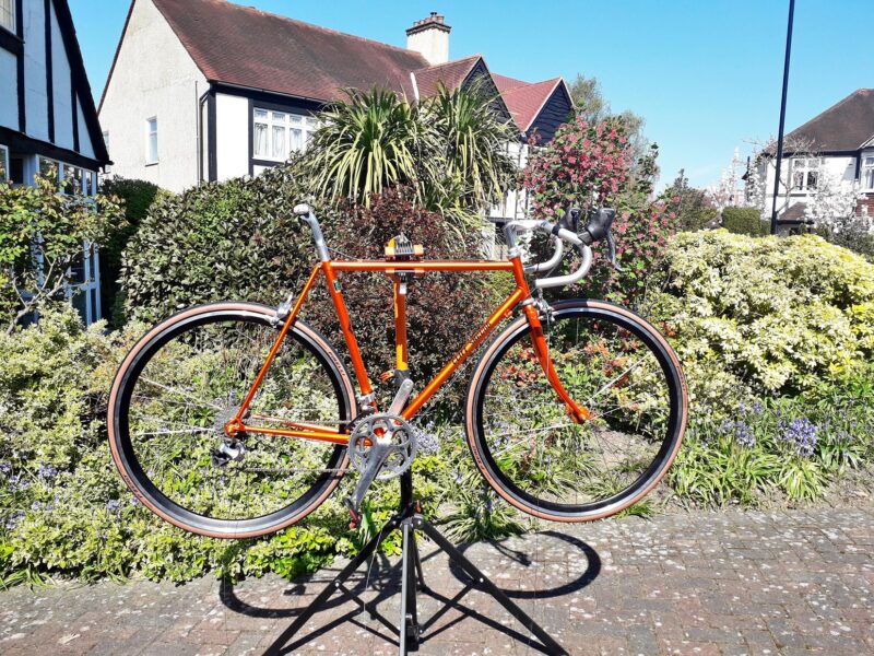 I also ordered some Brooks bar tape in brown. I ordered custom bar ends from Kapz with Sunseeker written on them – they where fairly dear but they look really good. I had to get some STI adjustment barrels for the frame in orange. Lastly I went through two sets of wheel alignment screws – have you ever tried to screw the end cap onto a screw with a spring? It’s so hard to do – I still have three missing caps in the kitchen somewhere. I was looking at getting some old style tyres but just in time Perilli launched a classic version of my favourite tyre the P Zero.