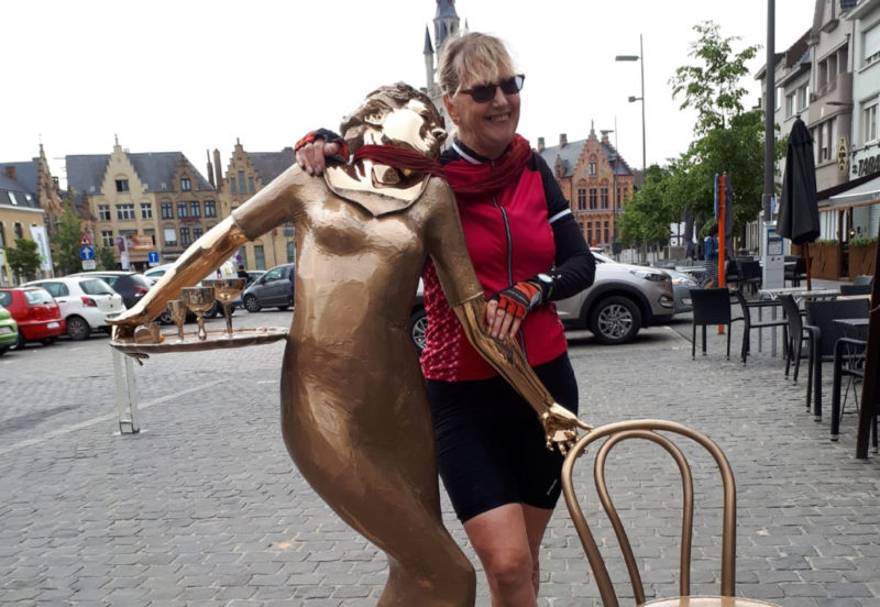 We had decided to get some miles done before having breakfast and arrived at Poperinge famished, so enjoyed some delicious pastries. These were served with a dollop of Advocaat – a traditional alcoholic beverage made from eggs, sugar and brandy and which went down a treat at 10am!! Poperinge is a lovely town very near the Belgium/French boarder. From 2015 Poperinge served as a garrison town to the British troops where they waited ready to advance on Ypres – the front line. A statue of ‘Ginger’ (Elaine Cossey) stood in the square. She was a red haired girl working at the café (owned by her father) and who had a mesmerising effect on the soldiers. So much so officers of all nationalities came to see her and the café soon became known as ‘Gingers’ rather than its previous French name.