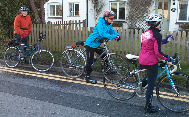 Hence an orange leader of some n’between years led the pack away up the long drag up to Nutfield. Here unfortified by alcohol or crisps Sandra, Ricki and Des are caught taking a breather …