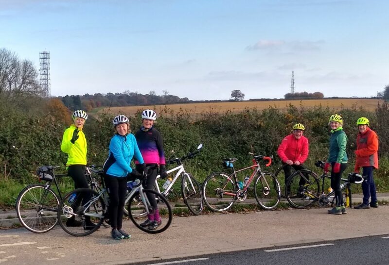 But the stop was not so that Anerley’s ladies could pose for Asif to take a picture, but because we had just had, “puncture!” called by Tom Tom. Only a slow one but it still needed an inner tube change. There is nothing worse than winter punctures, having worked up a sweat on the long climb to the top of the ridge, even though it was sunny, we soon began to feel the winter chill. Fortunately for Tom Tom, it was a front wheel, so much easier and quicker than a rear wheel. Plus Tom Tom was very efficient and organised, so got it quickly fixed whilst we all stood, shivered, and watched!