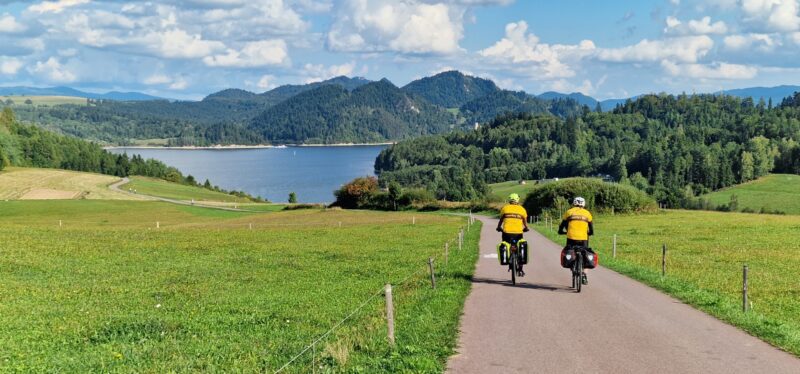 Finally, we were on our way downstream and at least on average we must have been heading downhill. The Velo Czorsztyn starts just outside Zakopane and follows the River Dunajec taking us much of the way to our penultimate destination at Tarnow. We were only doing a short 32 mile ride to Niedzica Zamek on the southern bank of Lake Czorsztyn on this day so could relax and enjoy the scenery. It seemed that the Tatra mountains were following us and the views were just magnificent.