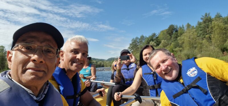 The Dunajec River marks the border with Slovakia in this area and as we paddled downstream with our new rafting buddies, we crisscrossed the border several times. At Červený Kláštor in Slovakia, we all disembarked and went into the Red Monastery for a much needed break. The Monastery ceased being a religious building in 1782 and is now a museum with a cafe and restaurant where a lot of rafting visitors stop for refreshments. While Asif enjoyed a cup of coffee, TomTom and I tried the beer that the Monastery is now famous for. Very nice indeed but quite intoxicating after being tossed around on the raft! There were several big rafts on the river, filled with Slovak tourists who were singing folk songs and cracking jokes with the Poles on our boat. We just enjoyed the scenery and the sound of laughter but had no idea what the jokes were.