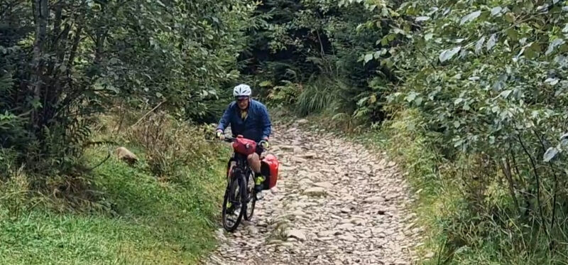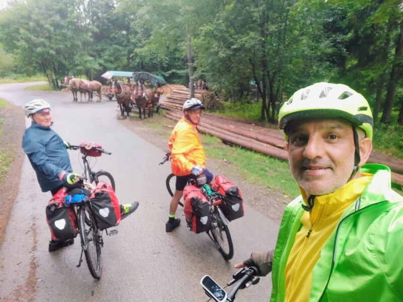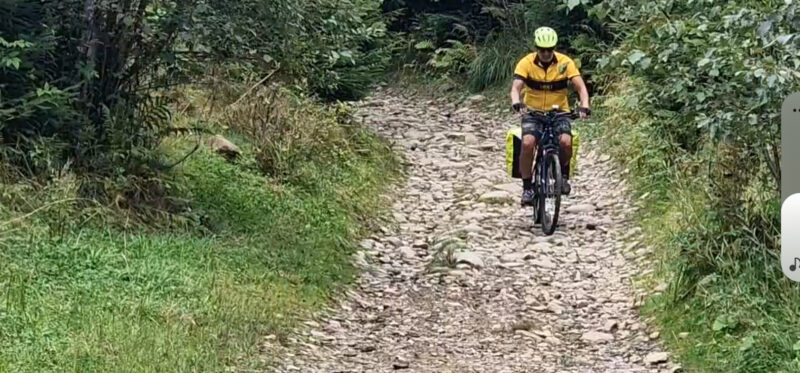 This was a tough day’s cycling. I haven’t mentioned, until now, each day started with a visit to a local supermarket to stock up on snacks (peanuts or snickers) and something for lunch, usually bread or croissants and some fruit. Asif also had to buy bottles of sugar loaded orange juice because of his diabetes. Well, it was all needed as we headed into proper mountain territory with a steady climb along a stream and a forest road up into Slovakia.