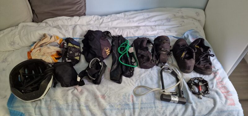 Although not strictly necessary, I usually carry a proper, heavy, gold rated D-Lock with me on tour. There is a fair amount of medicine that I have to take with me these days – well it keeps me alive so I shouldn’t complain. Apart from what you see, I wore hiking trousers, light fleece, rain jacket and Merrell walking shoes for the flight. These are all reasonable for off the bike moments like the hikes, dinners etc – but no use for a fancy restaurant or the opera.