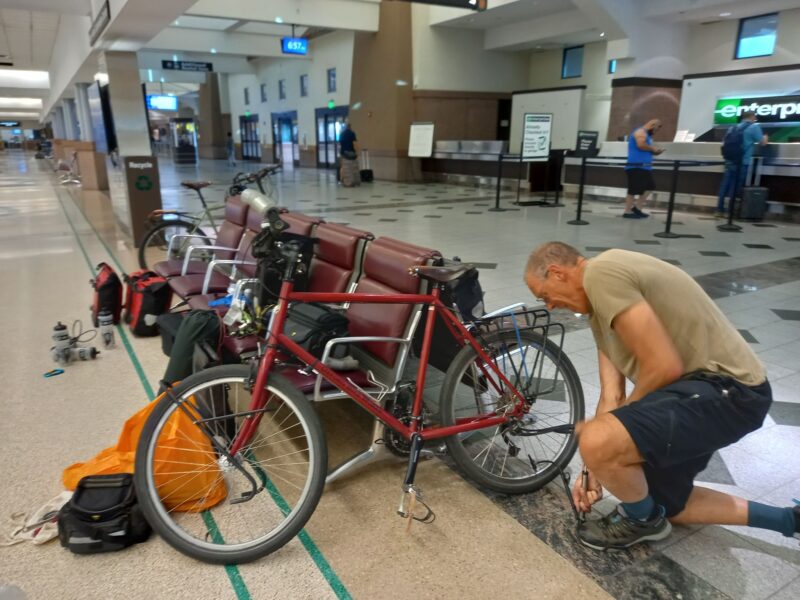 All packed up and ready to go we got a large taxi to take us to Heathrow and got through the stress of convincing the airline that our bikes could travel in large see through plastic bags. This was repeated when we got to Dallas to change flights but we arrived at El Paso safely with just one damaged bottle cage and proceeded to put our bikes back together in the airport.