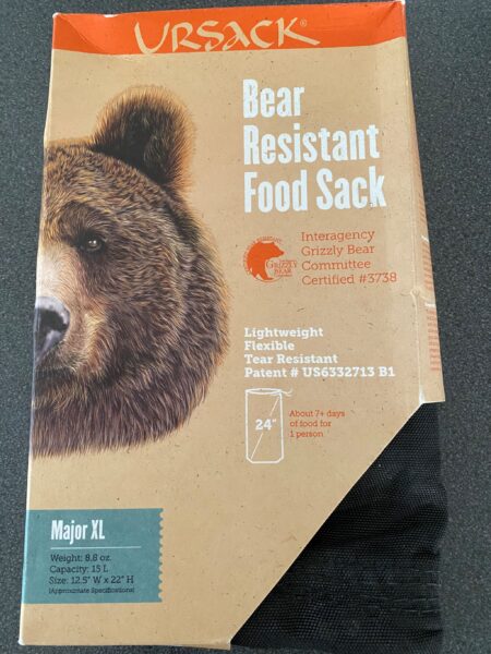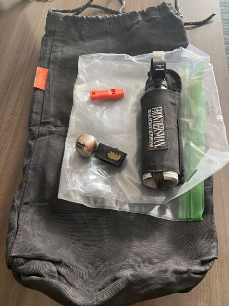 In response to this we bought odourless sealable plastic bags, very expensive bear proof bags for hanging our food in trees, carried a whistle, bought bear spray and bear bells (similar to the bells Morris Men use on their ankles) to attach to our bikes.