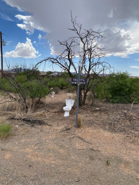 The first stage was 45 miles on a flat, tarmacked road across scrubby semi desert so we made reasonable progress. We had been warned that there would be lots of Rattle Snakes in the first few days so we were quite wary of leaving the road for a pee. We developed a technique of stamping our feet and walking slowly trying spot any camouflaged snakes. Needless to say, we didn’t spot one. We were slightly disappointed not to get a photo. To our relief we did come across this rest area with his and her’s facilities although the privacy wasn’t great!