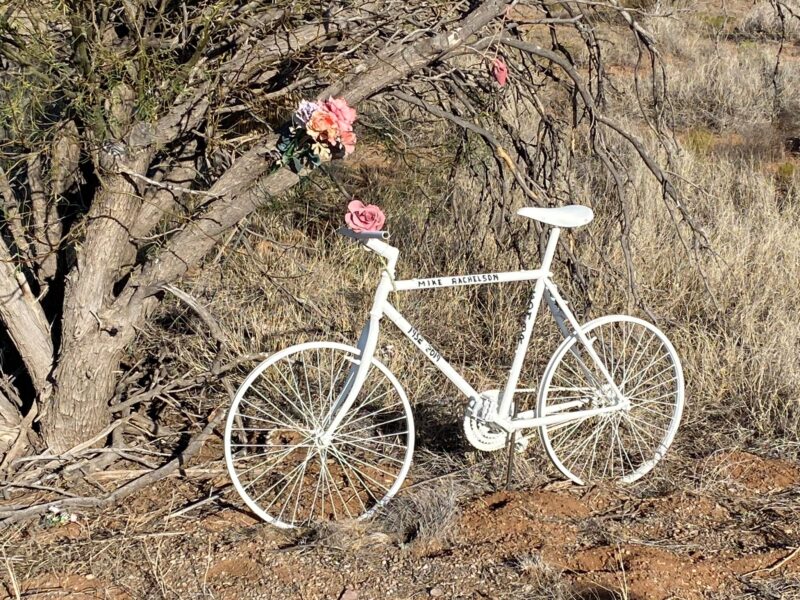 As we got nearer to Haticha (or our first night’s stop) we came across a bike painted white and decorated with flowers. Sadly, this was the bike of a cyclist that had ridden the Continental Divide from Canada but on this remote and quiet spot, just a few miles from finishing, had been the victim of a fatal hit and run accident. This seemed amazingly unlucky as we had only seen a couple of cars and a police border patrol all day.