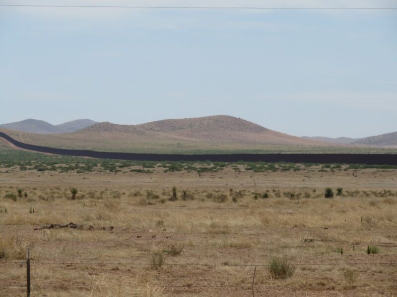 There is nothing at the border crossing other than a couple of official buildings and a large wall that curves along the Mexican border across the landscape.
