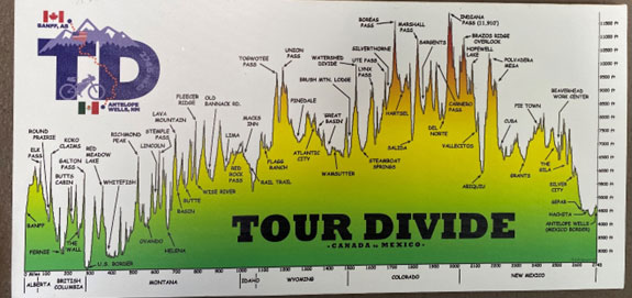 The Great Divide Mountain Bike Route (GDMBR) is Adventure Cycling’s premier off-pavement cycling route, crisscrossing the Continental Divide in southern Canada and the U.S. This route is defined by the word “remote.” Its remoteness equates with spectacular terrain and scenery. The entire route is basically dirt-road and mountain-pass riding every day. In total, it has over 200,000 feet of elevation gain. Nearly 2,100 miles of the route is composed of county, Forest Service, Bureau of Land Management (BLM), and Canadian provincial unpaved roads. The remainder is 60 miles of singletrack trails and 950 miles of paved roads including close to 50 miles of paved bike paths.”