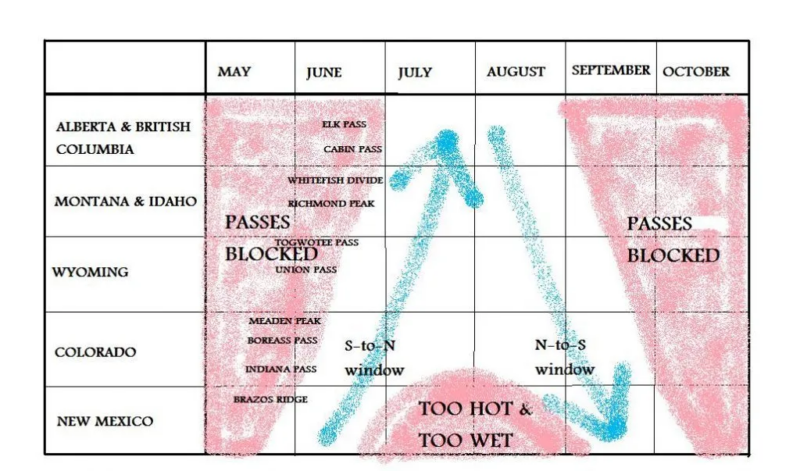 Next decision to make was when to go. After a bit of research, we came across the following graphic (by Mathieu van Rijswick). This shows the periods of time when the mountain passes are likely to be blocked with snow and also the periods when it is generally too hot or wet in the South.