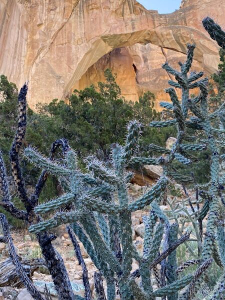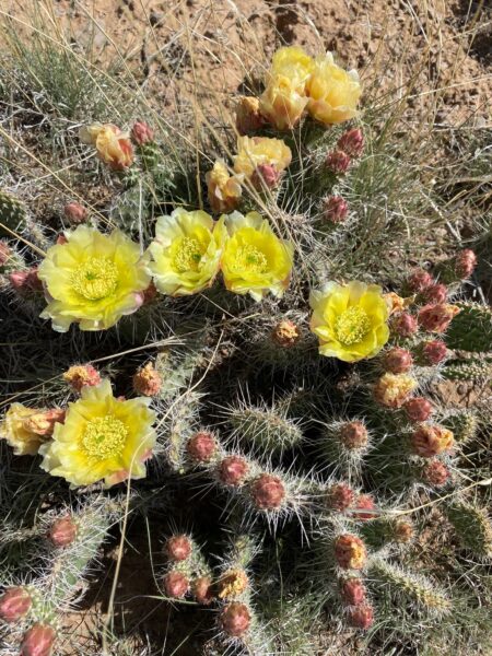 The next day we cycled through lava fields, and beside sandstone cliffs and a huge natural arch. The cacti were flowering bright yellows, reds and blues.
