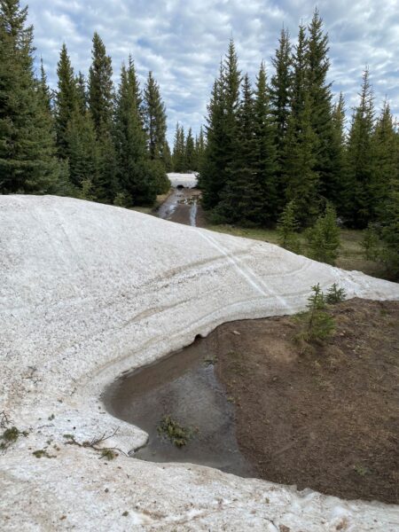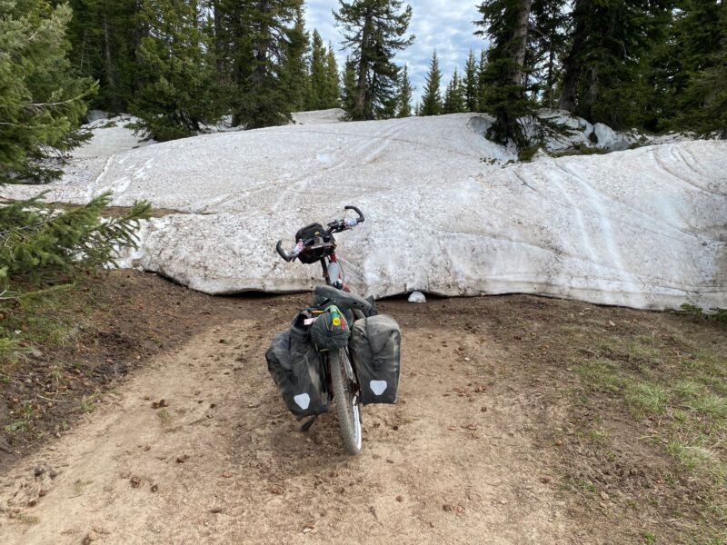 We descended by track to take lunch by a river just as steam train chugged across the opposite hillside on the Cumbres & Toltec Scenic Railway. Here we also saw the first southbound female racer, doggedly hugging the back wheel of a fellow competitor as they slogged up a long hill on the gravel. Shortly after we reached a tarmac’d road and we were in Colorado!